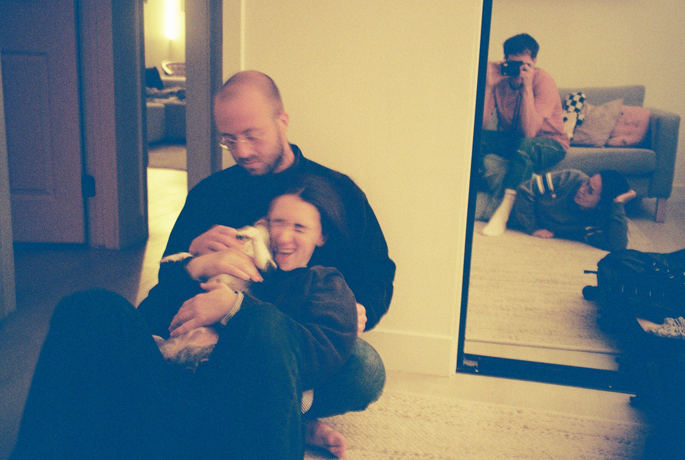 Isn’t this photo great? My friend Al and Nat with Jolene. Al is folded, soft eyes, and holding. Nat is warped as Jolene licks her, a mighty burst of joy. In the mirror are Jamie and Z. Jamie is lounging, propped on her elbow. Z’s legs are folded over Jamie as he leans to take the photo.